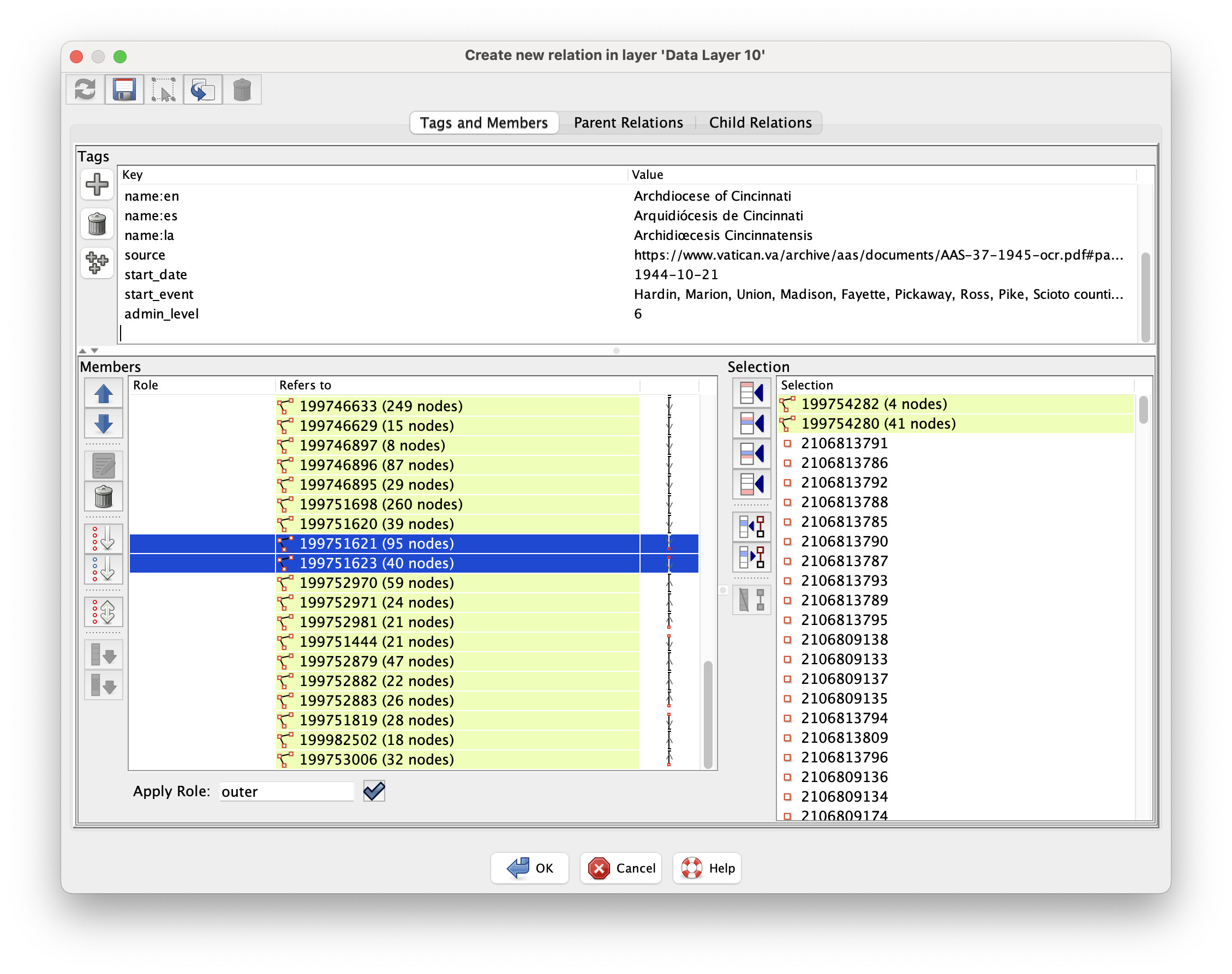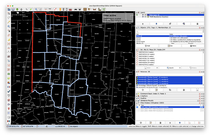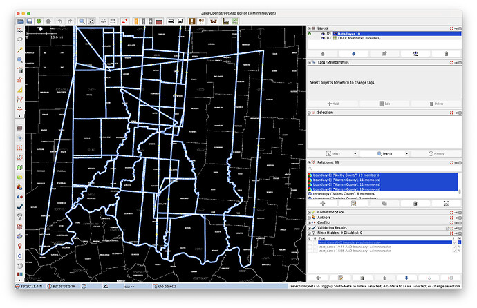 I chose JOSM for this mapping project because of its extensive suite of tools for working with relations. For each relevant county, I pasted the chronology relation’s ID into the Download Object dialog, then used the Relations panel to “Download with members” (so that none of the relations are listed as “incomplete”). As I worked backwards in time, I would repeat this step for any other counties that became relevant.