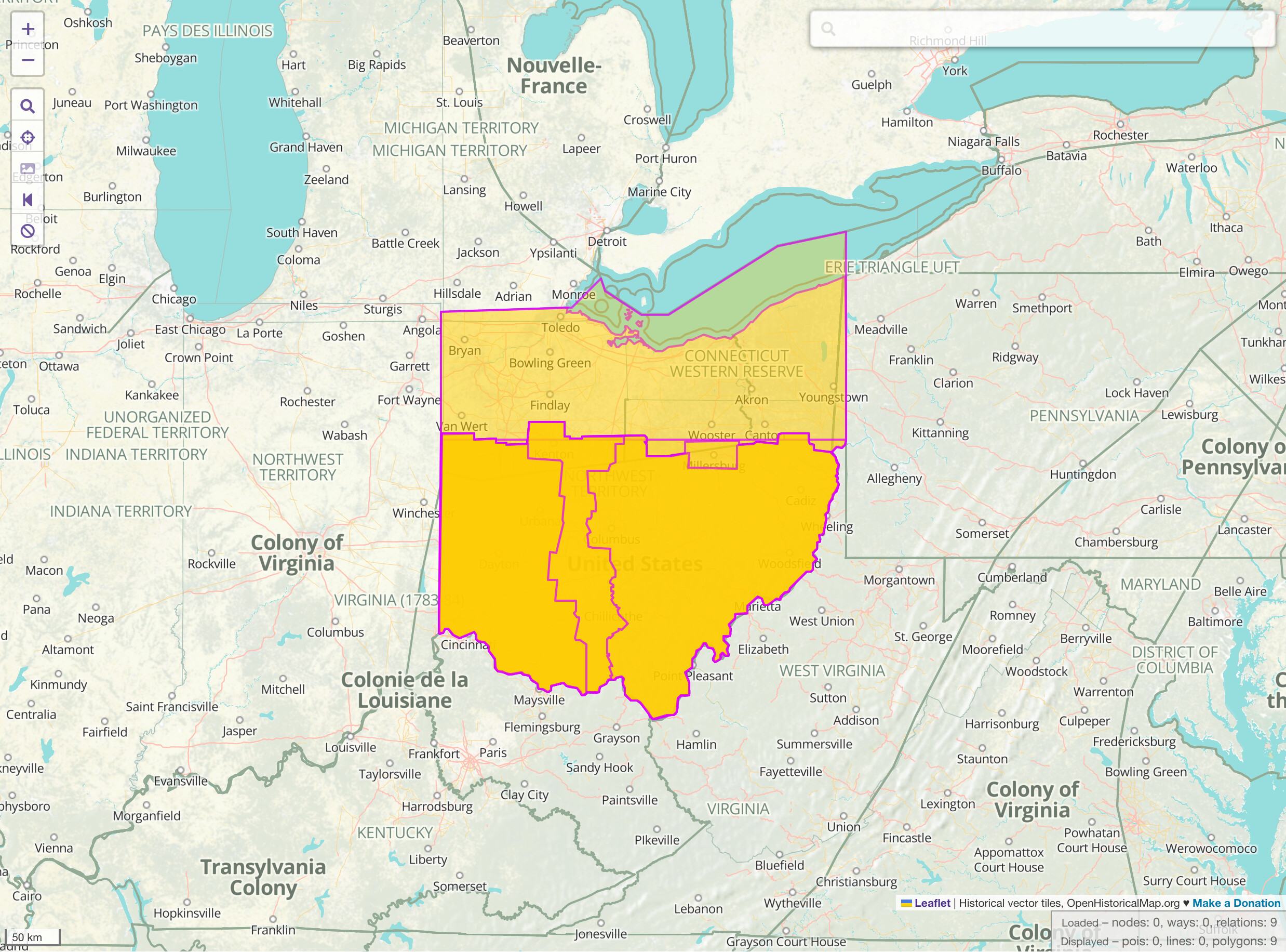 There’s plenty more to do from this point. We have St. Peter in Chains Cathedral in Cincinnati, but not St. Monica Church, which was the cathedral during the 1940s and ’50s. The Cincinnati diocese’s predecessors, the Dioceses of Bardstown, Baltimore, and Québec, would be major undertakings on the scale of country boundaries. These days, I live in a diocese descended from a briefly transnational diocese, which would be interesting to visualize. Maybe we could get our hands on information about boundaries at other levels of the ecclesiastical hierarchy, like deaneries and parishes, or the provinces of religious orders. Finally, other denominations and religions also have ecclesiastical boundaries that often follow the very same civil boundaries.